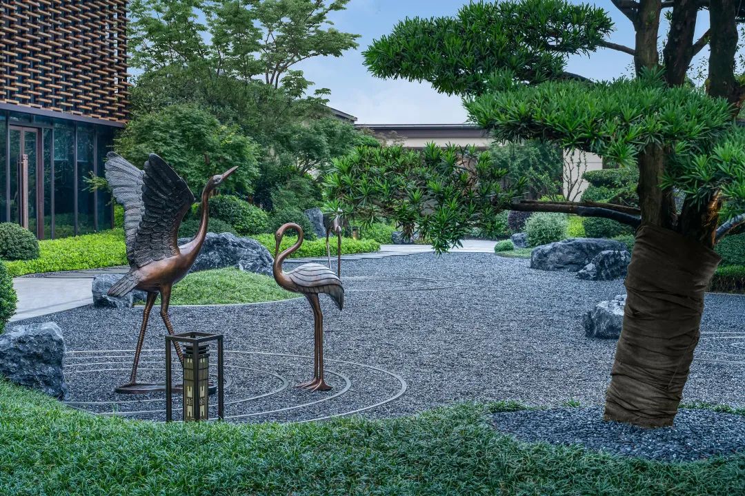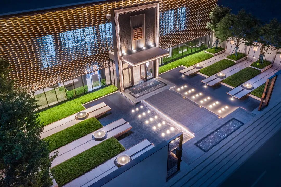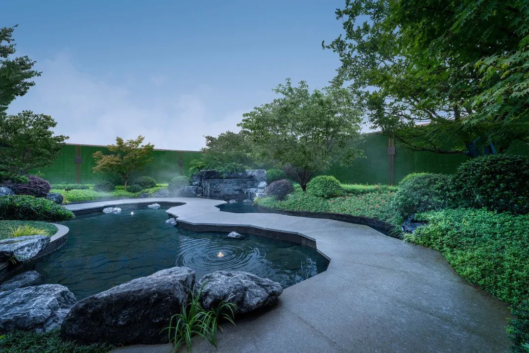 穿過售樓處建筑,豁然開朗,整個后場營造了一個極為簡潔純粹的空間,隨著晨昏的時間變化,交織的光影在景亭和水面上作畫,只為營造純粹的東方美學意境,整個庭院猶如一幅持續變化著的山水畫卷。