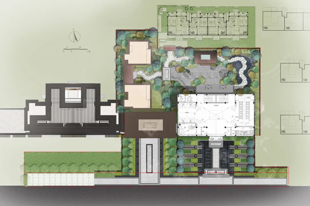 景觀設計將北側入口空間界定為城市展示界面,需要在回避場地外的不利條件的同時,解決銷售期間的停車、下客、接待等功能。