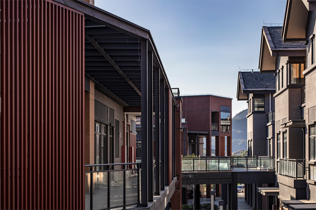 OUTLETS 商業(yè)區(qū)通過商墅本身的橫豎向自由穿插形成各種不同的體量,通過不同材料的變化,加上坡頂?shù)脑O計,既不失傳統(tǒng)建筑的低調雅致,又兼顧了現(xiàn)代感。