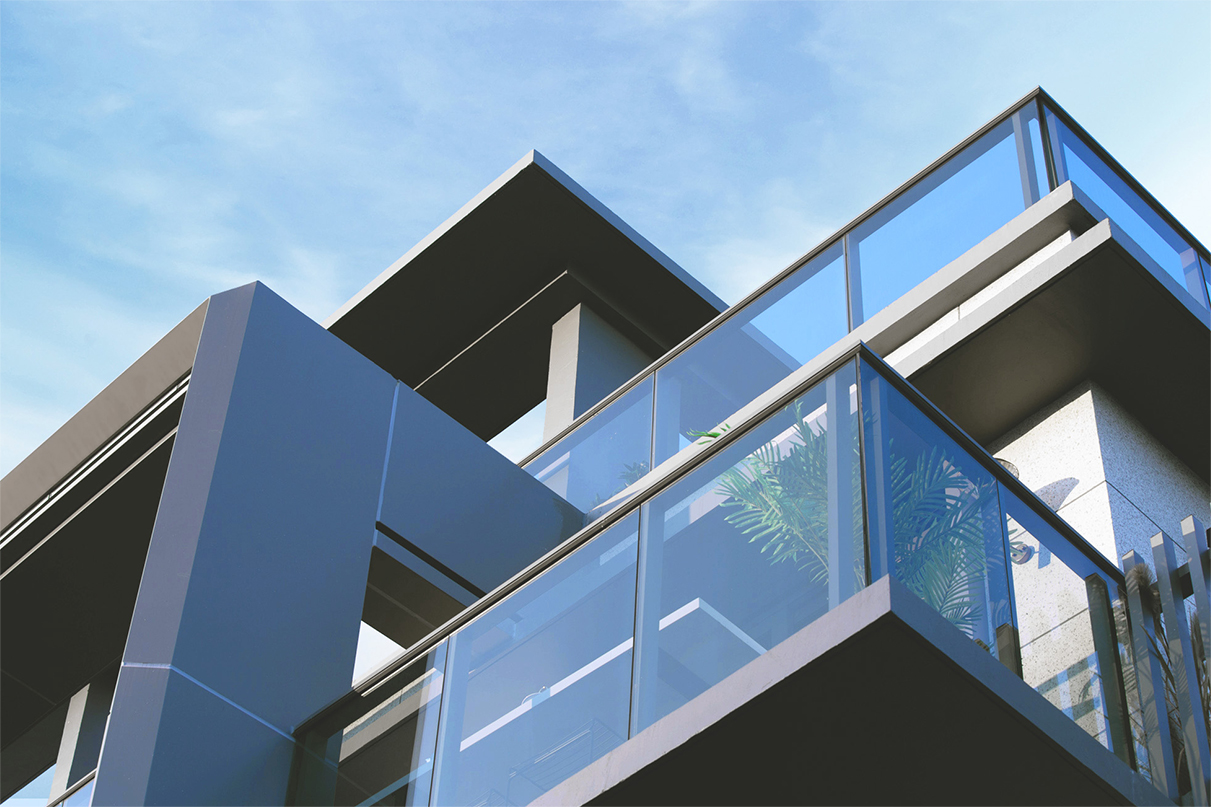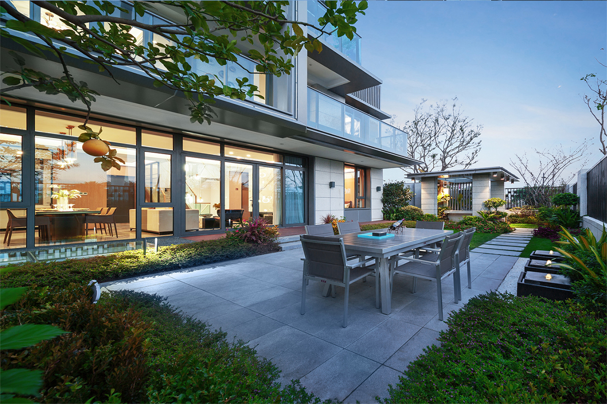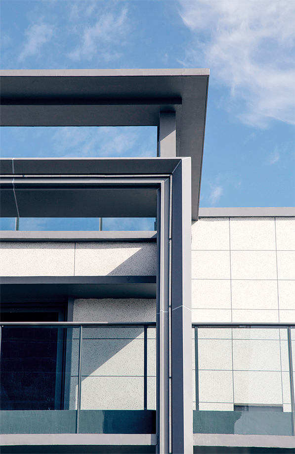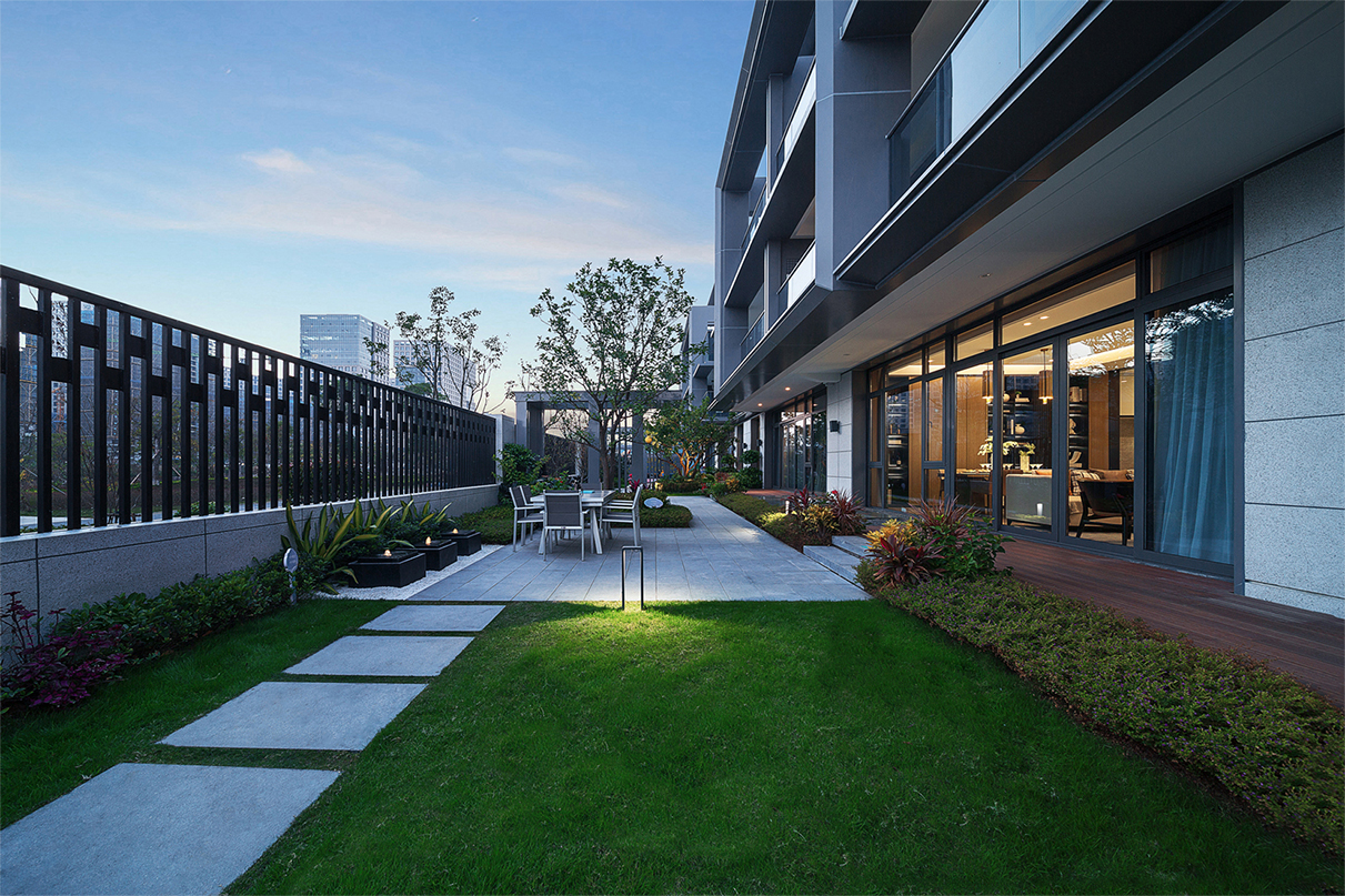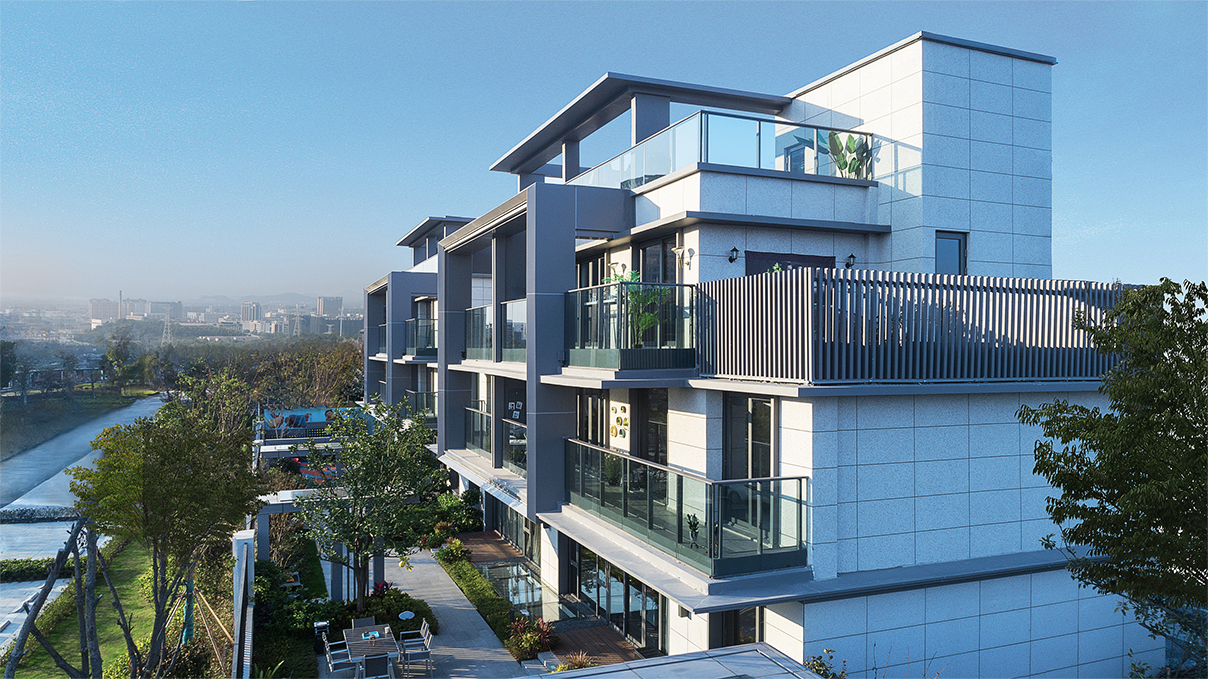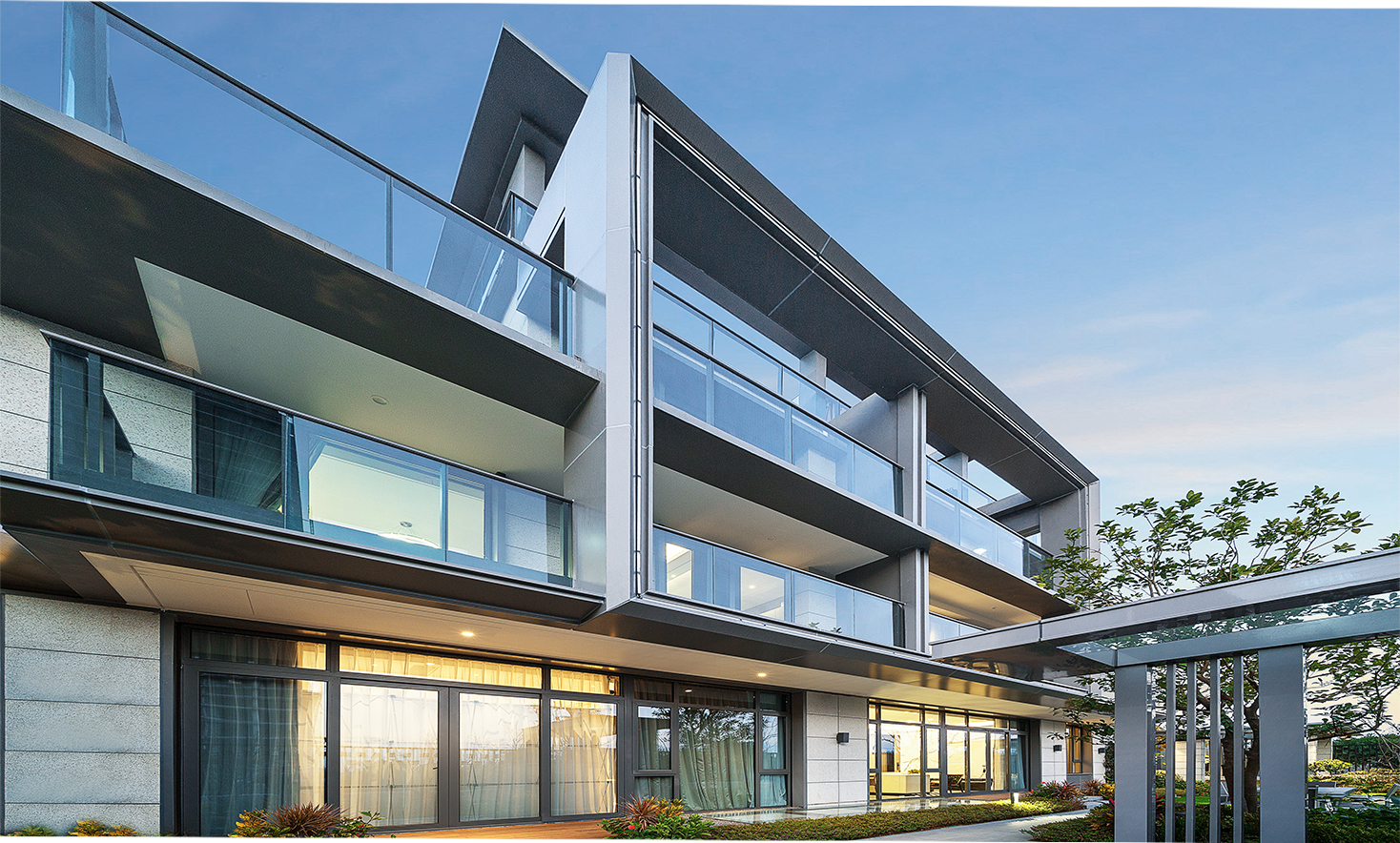 東方禪意與西方現代建筑對理性簡約美的崇尚,在審美價值觀層面水乳交融,形成了獨特的現代典雅建筑風格?,F代典雅住宅建筑端莊大氣,設計圍繞“純凈簡潔、輕盈飄逸”的理念,減少材料的種類,弱化了構件的厚度,突顯形體的輕盈挺拔。每個形態單元的構圖關系因此簡化為白色墻面與玻璃之間大實大虛的鮮明對比。為塑造形體輪廓的輕盈挺拔,建筑立面主要的豎線條,均做內收三角形斜切處理,并以鋁型材收邊。不同材質的精美交接,使形體轉折更加明確,賦予建筑冷峻的骨感美。