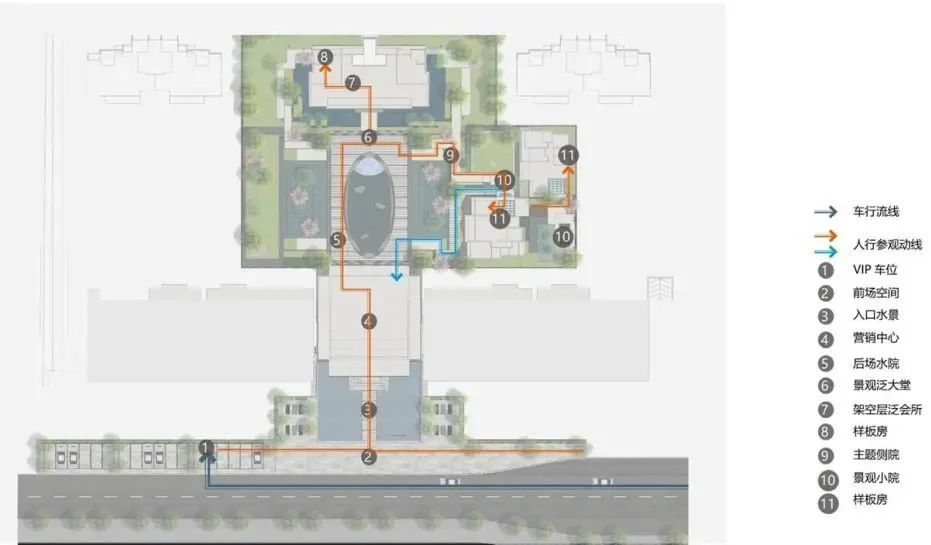 沿主路設(shè)置形象會所入口,進入小區(qū)后利用兩側(cè)景觀廊道和對景,圍合出禮儀氣質(zhì)的中軸草坪, 從舒適安靜的體驗中進入架空大堂的歸家路線,也讓社區(qū)居民在回家時產(chǎn)生抑揚頓挫的空間體驗變奏,強化了高端豪宅的格調(diào)氣質(zhì)