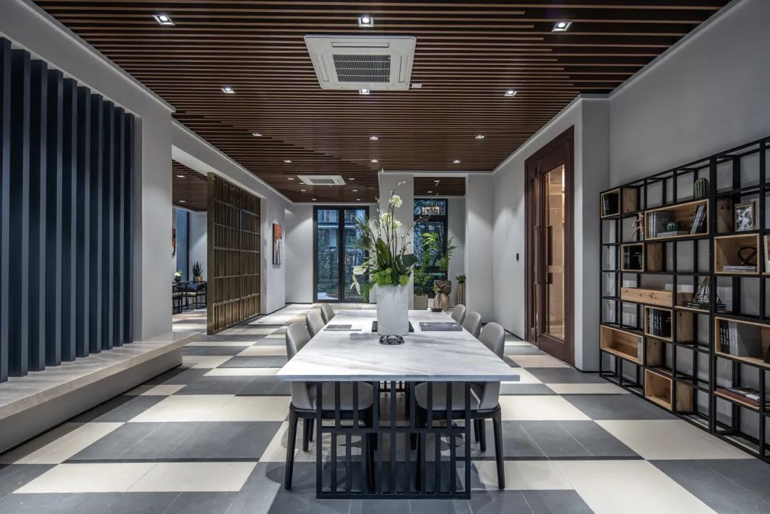 架空層設(shè)計-住宅區(qū)公共空間包括入戶門廳、公共配套等,較為常見的處理方式是以門廳作為室內(nèi)外空間的界限,并通過路徑和空間來營造歸家儀式感。隨著對居住環(huán)境品質(zhì)的更高需求,底層架空的設(shè)計逐漸流行起來。架空后的底層平面自然形成半室外空間用于鄰里交往、景觀營造、社區(qū)活動等多樣化功能,一定程度上解放了用地范圍內(nèi)的土地資源,也革除了建筑內(nèi)外空間界限。但在實際項目操作過程中,常因底層架空的歸屬邊界不清晰,導(dǎo)致成為建筑、室內(nèi)、景觀三不管的盲區(qū)。因此在這個項目中,我們牽頭整合了室內(nèi)和景觀的設(shè)計思路,建筑保證空間的連續(xù)性,地面造景交由景觀延伸,吊頂設(shè)備由室內(nèi)統(tǒng)一設(shè)置,最后圖紙整合,實現(xiàn)一體化的高完成度空間。